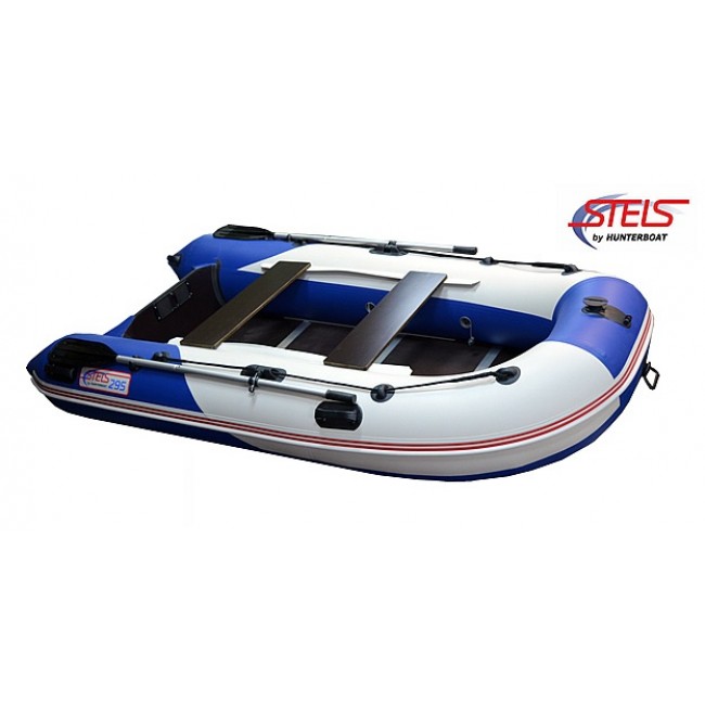 Надувная лодка СТЕЛС 295 изготовлена и ПВХ ткани плотностью 950 гр/м.кв., и представлена в современном дизайне и комбинированном сине/белом цвете.