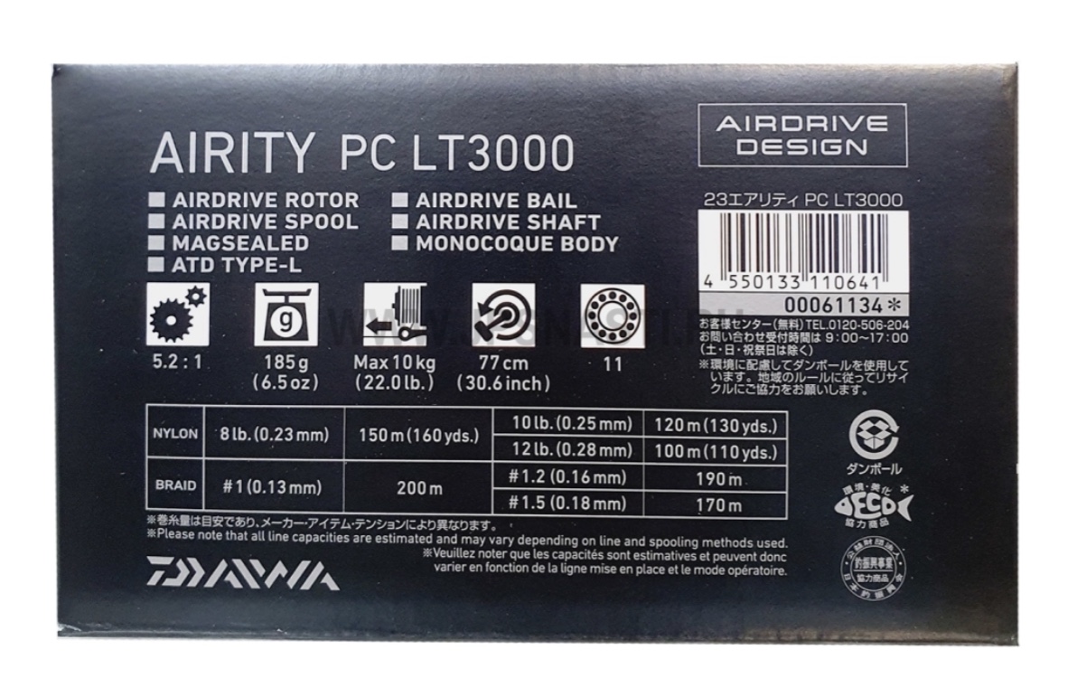 23 Airity является наследником 21 Luvias Airity, которая в момент своего появления на рынке рыболовных снастей вызвала огромный интерес среди рыболовов. 23 Airity PC LT 3000 выполнен в новом "Air Drive Design", что позволило уменьшить вес катушки и снизить инерцию вращения ротора. Корпус катушки выполнен по технологии Monocoque, что существенно увеличело жесткость механизма и позволило сделать ход более плавным.