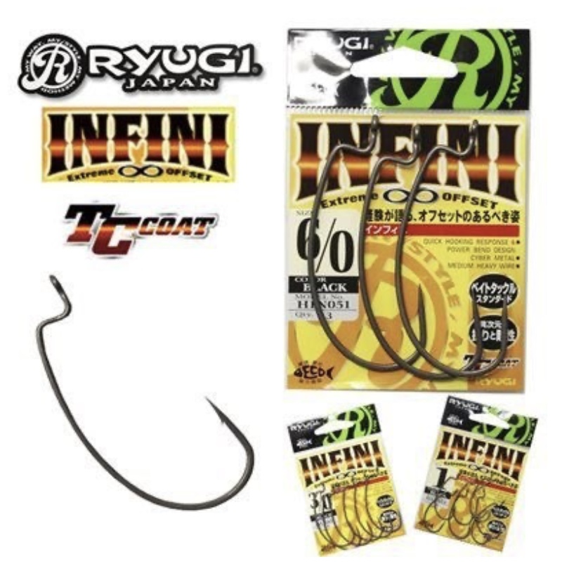 Infini — серия офсетных крючков от компании Ryugi, разработанных на основе многолетнего опыта компании специально для джиговой ловли. Их особенностью является сочетание невероятной надежности с высоким качеством засечки. Стальная проволока в производстве данной серии используется толстая, благодаря чему она крайне устойчива к деформации. Качество заточки жала и покрытия также находятся на высоком уровне, даже после множества поклевок крючок остается острым. Отличного показателя реализации поклевок, несмотря на толщину проволоки, удалось добиться с помощью продуманной овальной геометрии крючка и формы жала. Широкий поддев позволяет использовать большой спектр силикона и применять объемные приманки, которые трудно оснастить офсетником со стандартным поддевом. Серия имеет восемь размерных вариаций — от № 2 до № 6/0, что позволяет оснастить ими все стандартные размеры приманок.