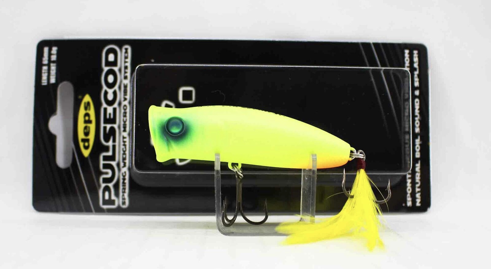 Воблер Pulsecod - поппер от компании Deps. Область применения его - это в основном ловля у поверхности воды на неглубоких, заросших травой водоемах, или же просто в верхних слоях воды. Отличительной чертой во внешнем облике Pulsecod является большая лобовая часть. Звуки, издаваемые им на рывках, очень интересные. В головной части находится пружина с шариком, и воблер продолжает вибрировать при остановках. Габариты этого поппера довольно внушительные, что предполагает работу не только по окуню, например, но и по щуке. У воблера Pulsecod внутренняя оригинальная система балансировки, благодаря чему воблер на паузах ведет себя очень заманчиво для рыбы, образуя колебания определенной амплитуды и ритма.