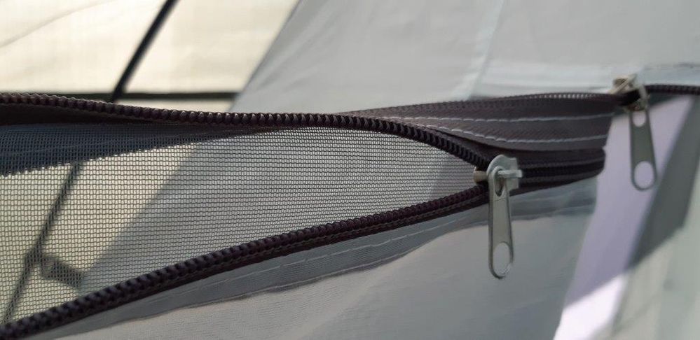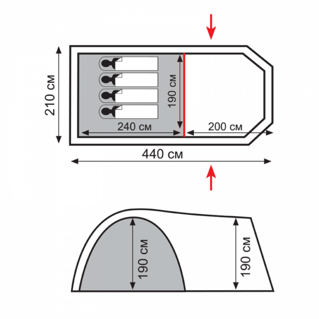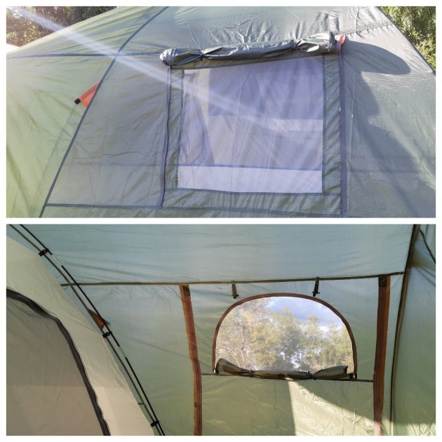 Палатка очень большая и с легкостью вмещает в себя семью из четырех человек. Также она имеет высокие потолки, что не препятствует свободному перемещению. Рекомендую!