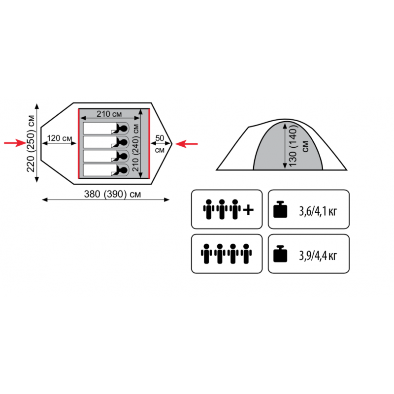 - Ткань внутренней палатки: Polyester дышащий;