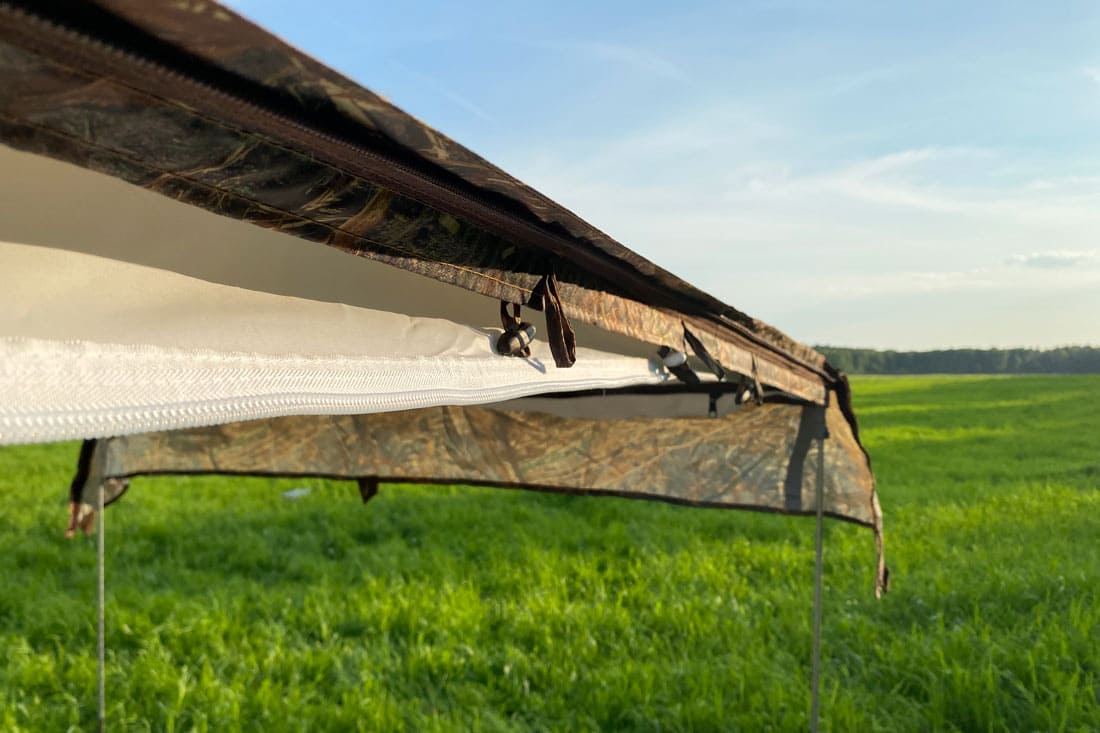 - Откидная торцевая стенка. С помощью этой функции кемпинг в теплое время года становится более комфортным. Стенка послужит навесом для оптимизации пространства перед палаткой: под навесом можно организовать обеденную зону. Для установки навеса в комплекте с палаткой Кубоид предназначены опорные стойки. При монтаже откидной стенки вход закрывается москитной сеткой;