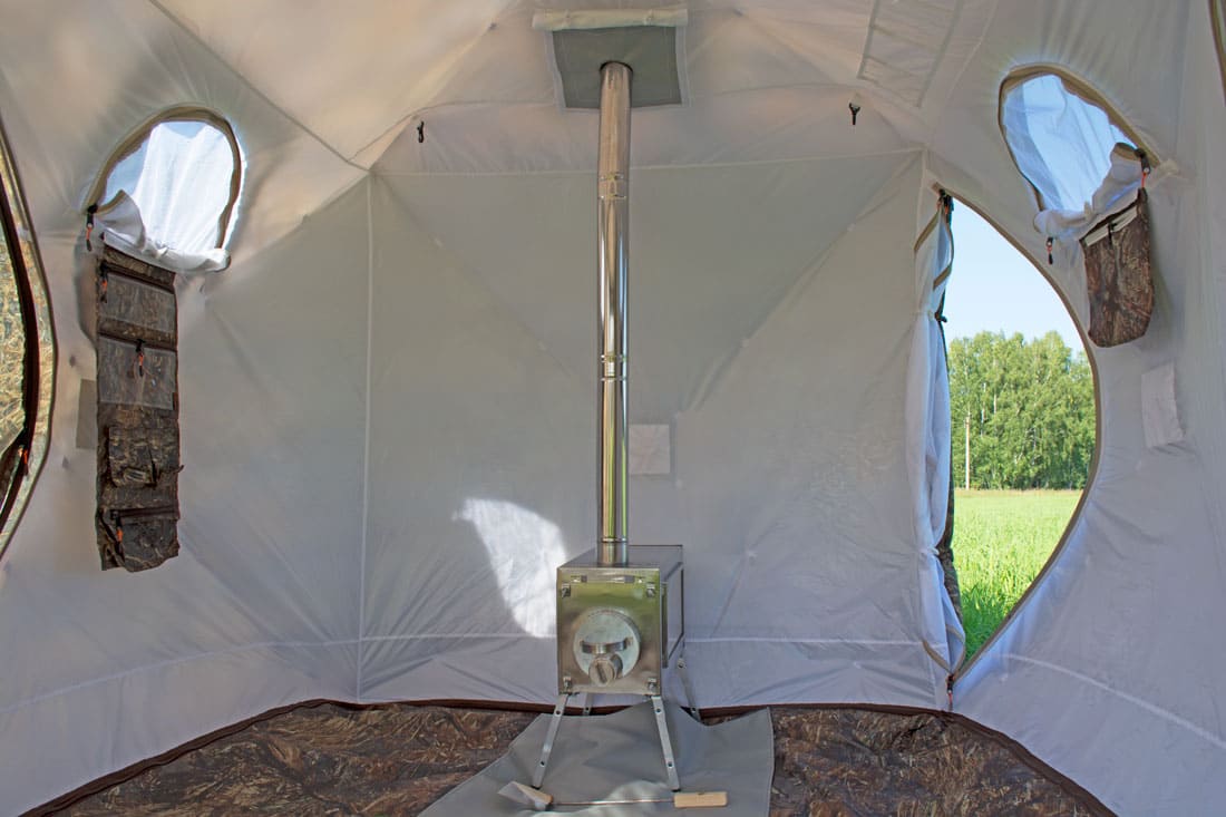 - Куб 3.60 Берег оснащен двумя разделками дымохода с металлическим кольцом 90 мм для походной печи. Отверстие для дымохода представляет собой термостойкую ткань с металлическим кольцом. Кольцо обеспечивает фиксацию трубы дымохода, а также предотвращает повреждение тента палатки. Разделка дублируется на обоих слоях. При использовании палатки Кубоид 3.60 без печи, отверстие для дымохода закрывается защитным клапаном на липе с наружной стороны;