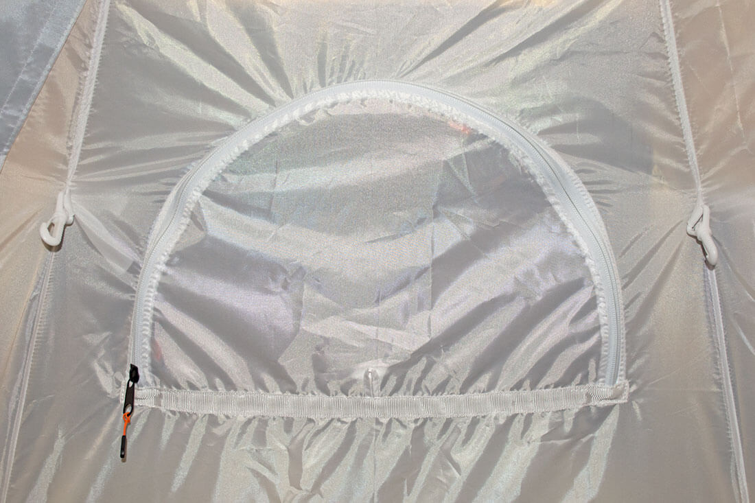 Многофункциональные окна палатки УП-2 состоят из нескольких слоев: защитный клапан с жесткой опорой на липе со стороны внешнего тента, оконное заполнение из прозрачной морозостойкой силиконовой пленки (температура использования до - 50 °C), внешний тент на молнии, антимоскитная сетка на молнии, внутренний тент на молнии.