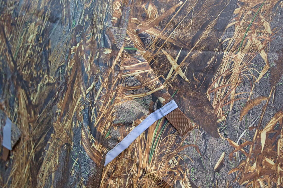 Внешний тент соединен с каркасом надежными липами из морозостойкого ПВХ. Такие липы имеют достаточно широкий размер и находятся в местах сгибов, предотвращая складывание дуг, а также защищая тент палатки от механических повреждений.