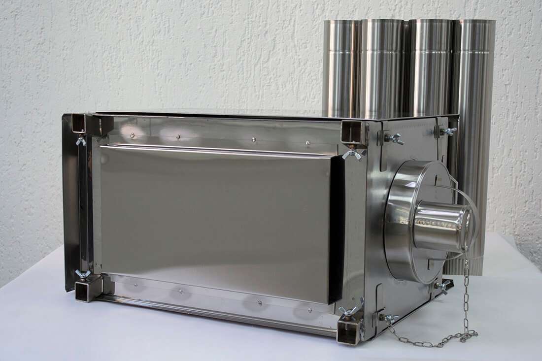 Конструкция печи включает в себя: короб (топочную камеру), искрогаситель, съемную топочную дверцу и стакан для регулирования подачи кислорода, отражающие экраны с 4 сторон, съемные ножки, дымоход.