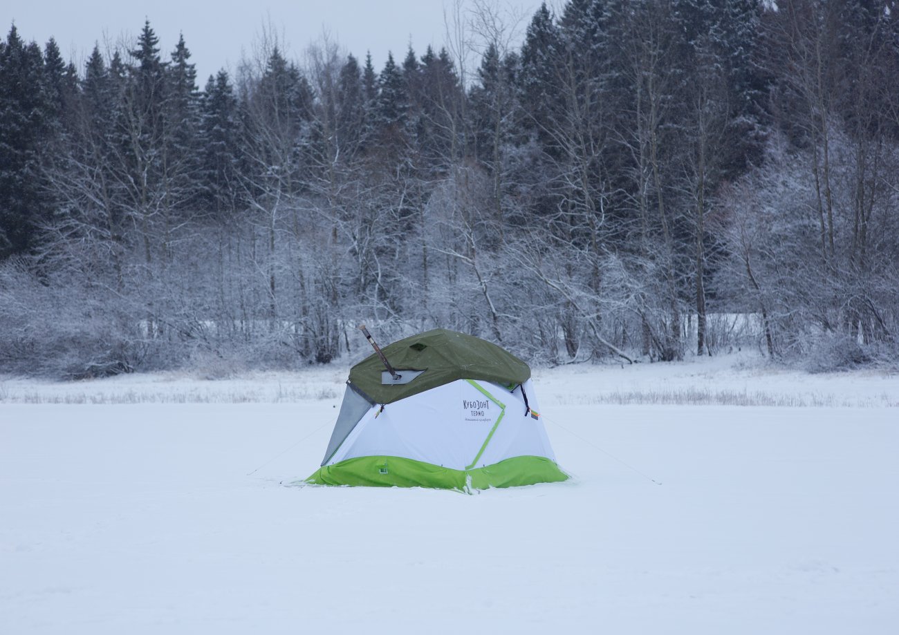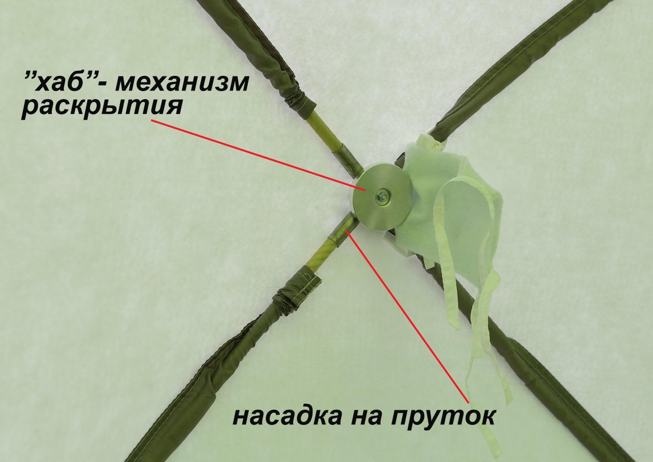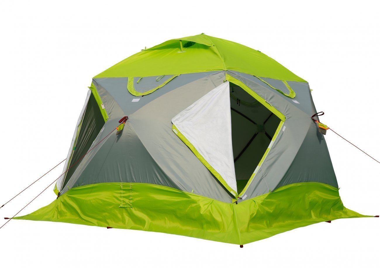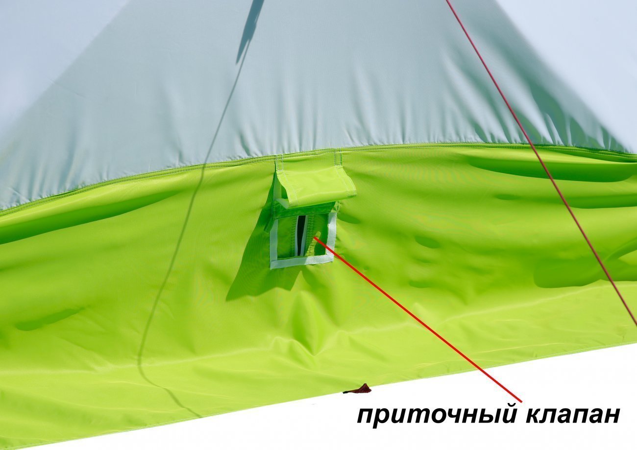 Влагозащитный тент дублирует все функциональные элементы палатки обеспечивая укрытию полную защиту от дождя (опция). - Высокая свето-проводимость тента, выполненного в серо-салатовом цветовом исполнении с использованием светопроводящих тканей и утеплителя.
