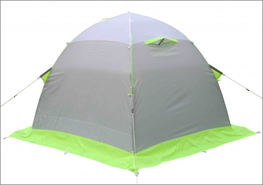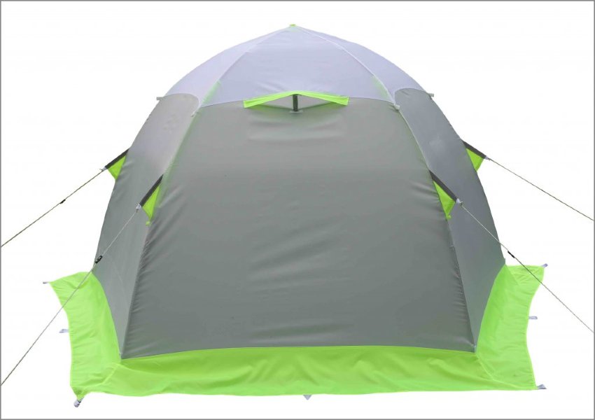 Палатка предназначена для использования в зимнее время года и способна выдерживать температурные показатели до -50 градусов благодаря некоторым конструктивным особенностям:
