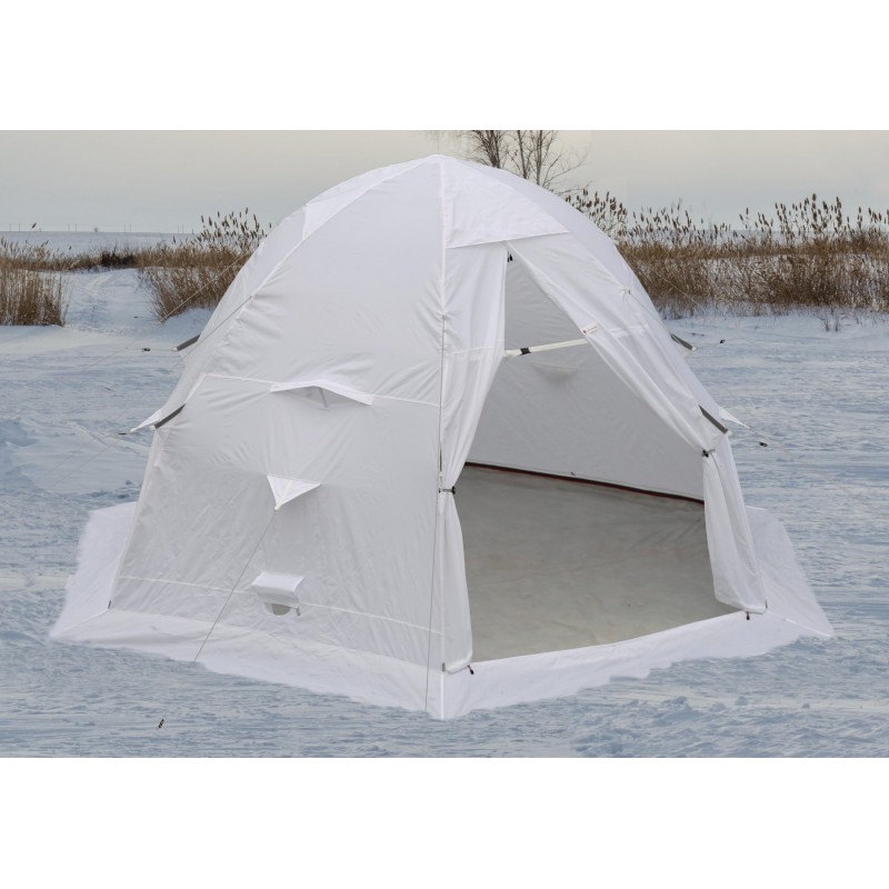 - Основой конструкции палатки теперь является шестигранный каркас, образующий купол. Большой размер не является помехой для эксплуатации её при любой погоде. Для надёжной фиксации на льду она оборудована рядом усиленных креплений. Даже ветра со скоростью 100 км/час не способны стронуть её с места.