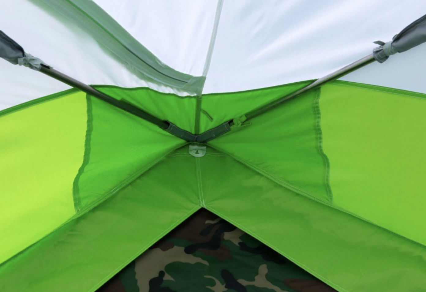 Палатка крепится к гидроизоляционному дну (опция, приобретается отдельно) при помощи петель, которые расположены под внешней юбкой, при этом сама юбка обеспечивает надежную защиту от попадания осадков внутрь «гидро-корыта».