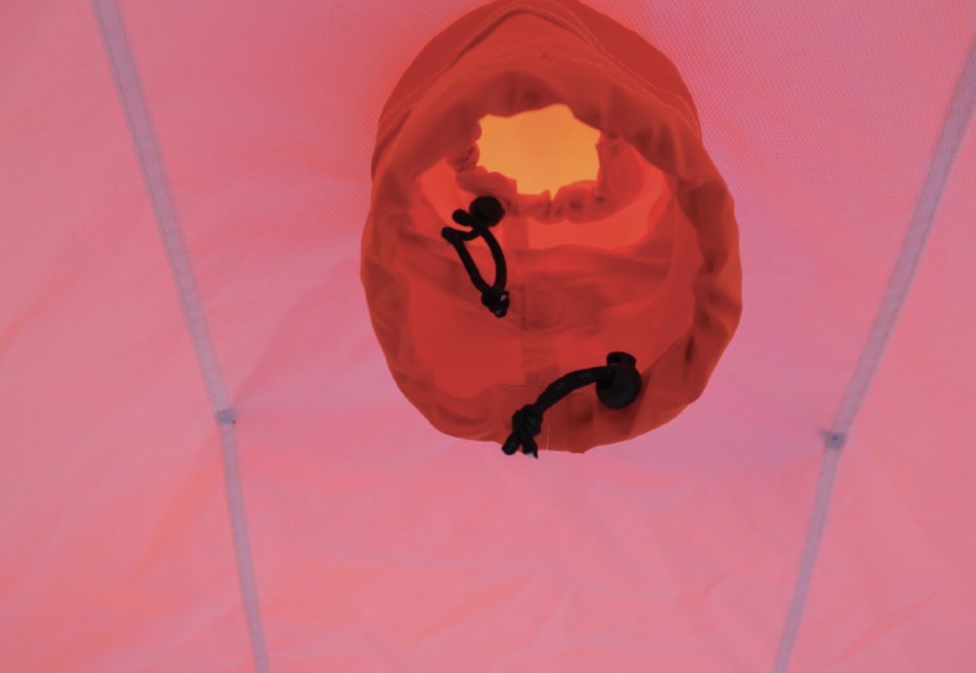 -Оригинальный дизайн наружного тента. Оранжевый верх купола палатки издалека виден днем и хорошо заметен ночью (при горящем фонаре)