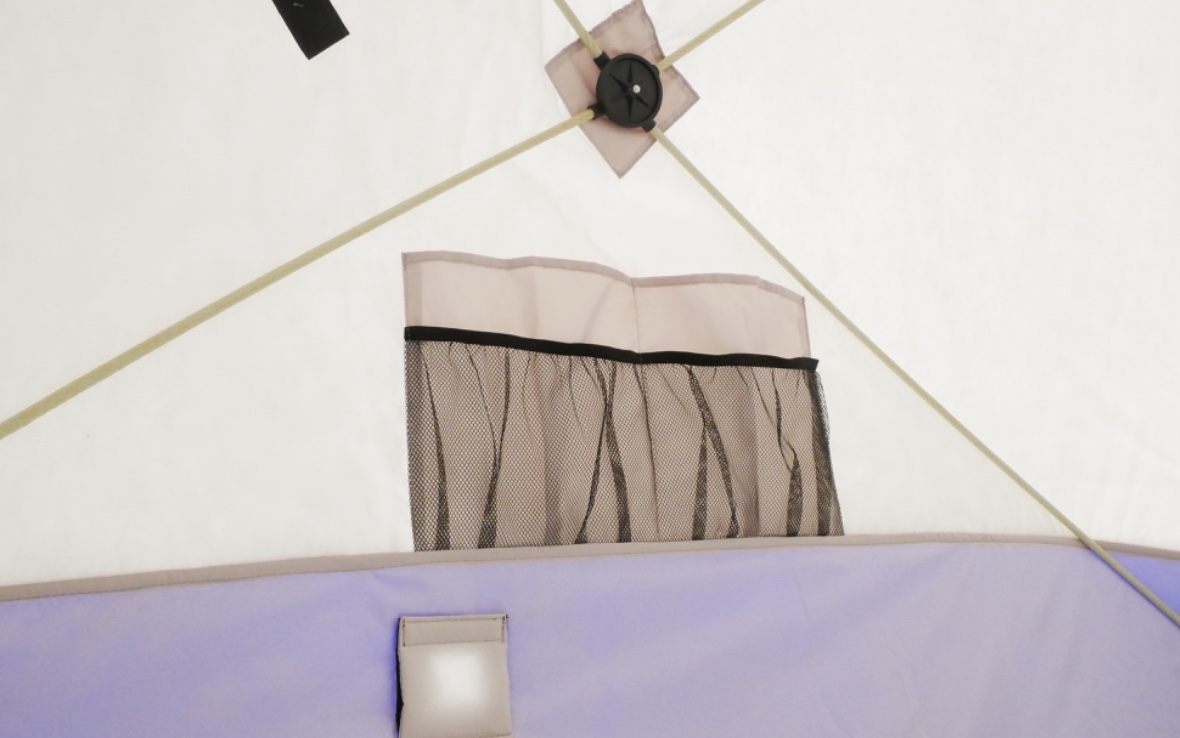 Внутреннее расположение карманов и сеток позволит разместить все необходимые вещи, которые будут всегда под рукой. Наличие трех окон позволит удобно расположить отопление палатки.