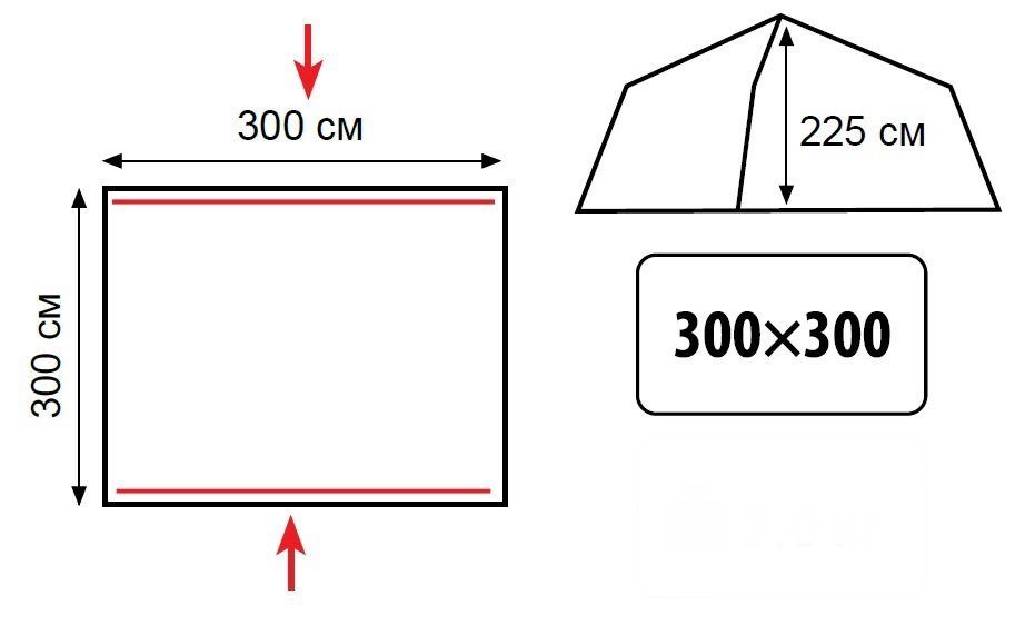 Размер шатра 3 на 3 метра высота - 2.25 метра, что позволяет стоять высокому взрослому человеку в полный рост не сгибаясь.