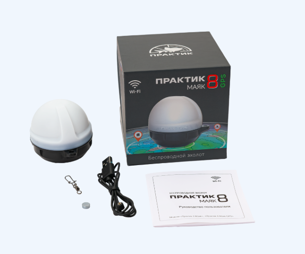 В комплектацию входит: эхолот "Практик 8 Маяк GPS", магнит для включения эхолота, вертлюжок для крепления к удилищу, зарядный кабель и инструкция.