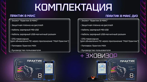 С помощью OTG-переходника эхолот подключается к смартфону и через мобильное приложение "Мой Практик" можно легко и быстро обновить ПО эхолота.