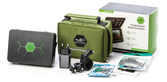 Камера МУРЕНА в базовой комплектации оснащена всем необходимым для скорейшего начала использования: камера, переносной монитор, сумка-чехол, SD-карта на 8 Гб с адаптером, фиксатор монитора на удочку, фиксатор монитора на руку.