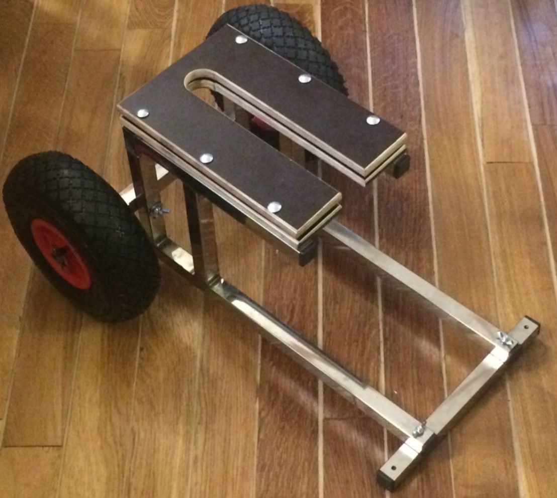 Разборная ТЕЛЕЖКА для лодочных моторов 2 - 20 л.с. изготовлена из полированного нержавеющего профиля 25х25 мм, ламинированной фанеры толщиной 15 мм. Крепеж - мебельный болт, барашковая гайка. В комплект входит стропа с пластиковой рамкой для фиксации мотора. Габариты с колесами д520х480х350 мм