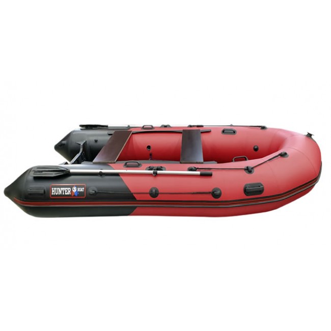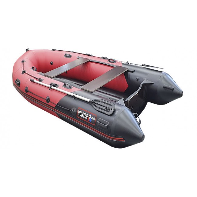 Надувная лодка Хантер 350 ПРО со стационарным вклеенным умеренно-килевым дном низкого давления (НДНД) рассчитана на использование с мотором до 15 л.с. с максимальной загрузкой до 600 кг. Предназначена для рыбалки, охоты и активного отдыха на воде небольшой компанией. Выпускается в двух расцветах - комбинированном красно/черном цвете и комбинированном черно/камуфлированном цвете.