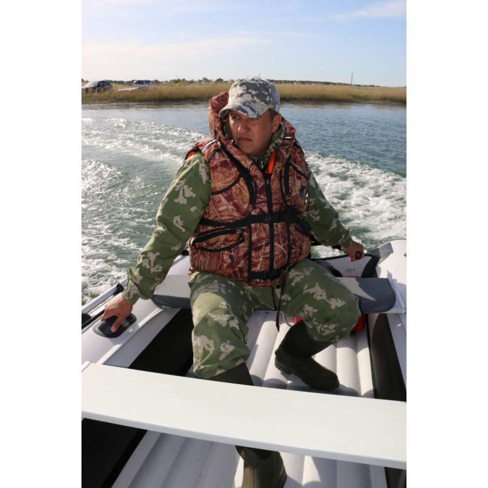 Теперь об отличиях этой лодки. Надувное дно низкого давления наших лодок мы постарались сделать максимально тонким по двум причинам, во -первых: чтобы сохранить комфортную высоту посадки в лодке, чтобы в лодке было удобно сидеть, и ваши колени находились в естественном положении, высота от пола до верха банки по центру 34 см., а это значит вам будет удобно в нашей лодке даже при длительном переходе и рыбалке. Во вторых, минимальная толщина днища дает еще одно преимущество, центр тяжести смещен ниже чем у лодок с толстым днищем, а это положительно влияет на управляемость и устойчивость лодки на воде. При этом благодаря прочным перегородкам днище не переламывает и оно сохраняет форму на всех режимах эксплуатации.