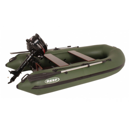 Надувная лодка ПВХ Reef 290KC с жестким фанерным пайолом + стрингера - это моторно-гребная лодка эконом класса Reef со стационарным транцем, килем, фанерным пайолом + стрингера (2 шт.) и передвижными банками.