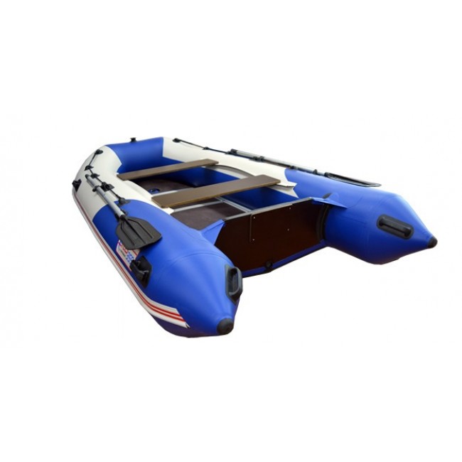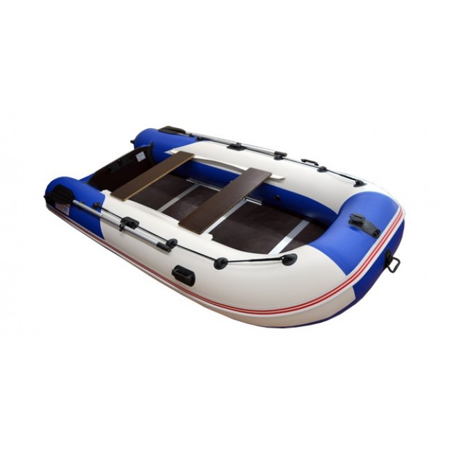 Надувная лодка СТЕЛС 355 изготовлена и ПВХ ткани плотностью 950 гр/м.кв., и представлена в современном дизайне и комбинированном сине/белом цвете.