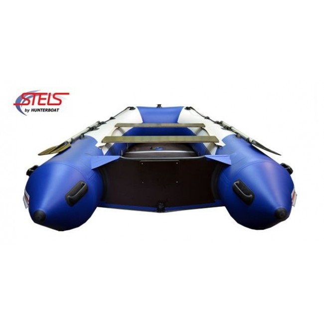Надувная лодка СТЕЛС 375 изготовлена и ПВХ ткани плотностью 1050 гр/м.кв., и представлена в современном дизайне и комбинированном сине/белом цвете.