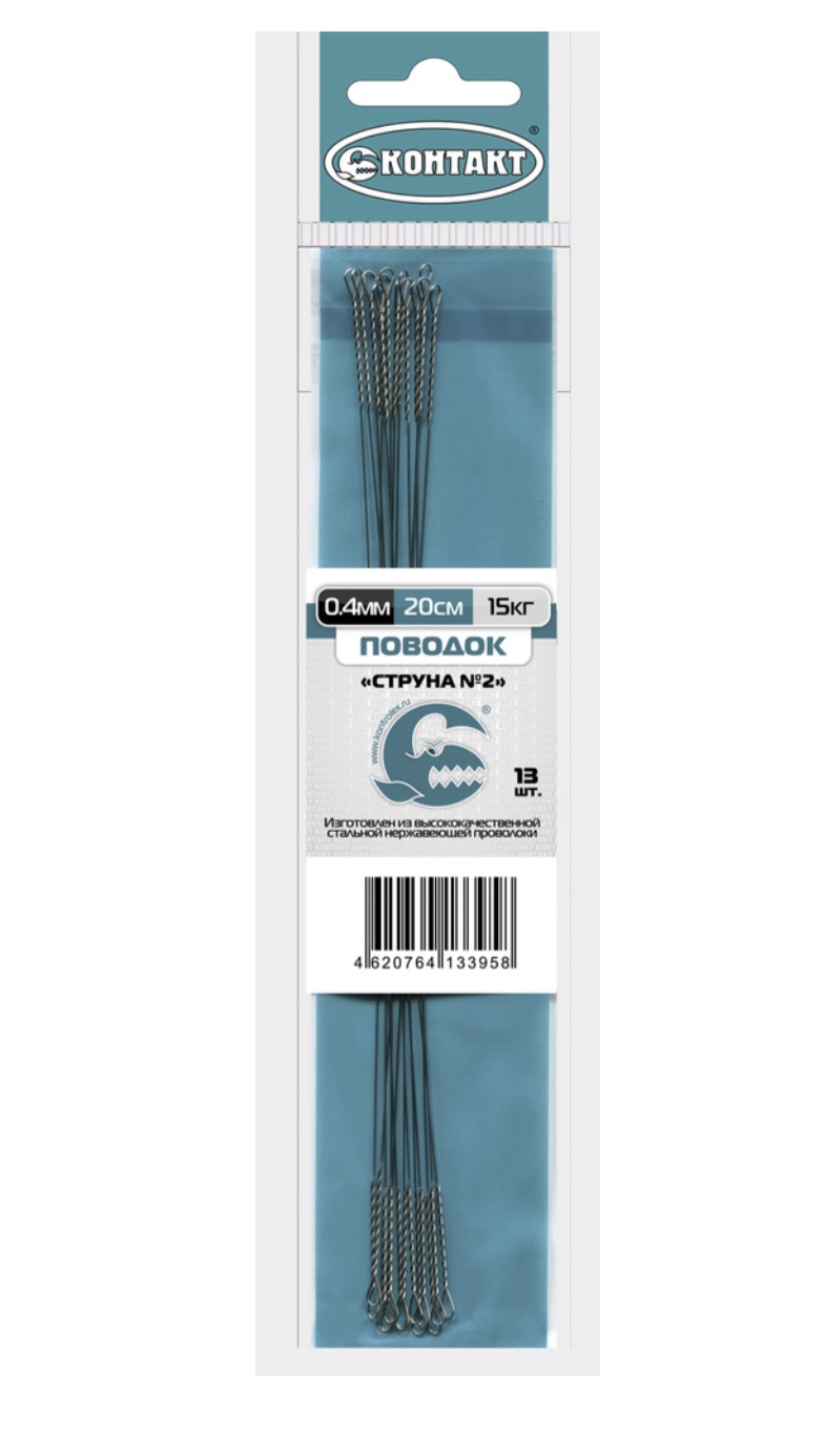 Поводок КОНТАКТ "Струна №2", диаметр 0,4 мм, тест 15 кг, длина 20 см.