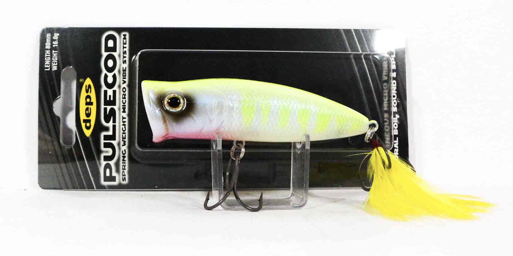 Воблер Pulsecod - поппер от компании Deps. Область применения его - это в основном ловля у поверхности воды на неглубоких, заросших травой водоемах, или же просто в верхних слоях воды. Отличительной чертой во внешнем облике Pulsecod является большая лобовая часть. Звуки, издаваемые им на рывках, очень интересные. В головной части находится пружина с шариком, и воблер продолжает вибрировать при остановках. Габариты этого поппера довольно внушительные, что предполагает работу не только по окуню, например, но и по щуке. У воблера Pulsecod внутренняя оригинальная система балансировки, благодаря чему воблер на паузах ведет себя очень заманчиво для рыбы, образуя колебания определенной амплитуды и ритма.