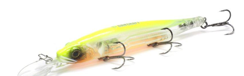По сравнению с массивной большей моделью Ayuja128 Rest недавно вышедшая приманка GanCraft Ayuja108 Rest выглядит более изящной и худощавой - при разнице в длине в двадцать миллиметров ее вес составляет всего лишь четырнадцать граммов. Именно поэтому GanCraft Ayuja108 Rest будет более востребована у среднестатистического потребителя,так как тягать этот воблер можно более легкой палкой и он значительно менее упорист,а для многих спиннингистов это является очень важным.В модели установлена магнитная система дальнего заброса с тремя шарами,а в хвостовой части приманки зафиксирован еще один шарик небольшого размера,так что с полетными качествами у GanCraft Ayuja108 Rest все в полном порядке,и негрубой снастью забросить ее можно достаточно далеко и точно.На твиче приманка более живая и верткая,причем совершенно нетребовательна к стилю проводки.Если 128-ая Айюджа на твиче очень упориста и показывает геометрически правильную «елку»,рыская поочередно то влево,то вправо,то меньшая модель при более агрессивной проводке очень широко ходит по сторонам,при более сильном рывке или потяжке немного срываясь на вертикаль.Причем если большая модель из-за сильной упористости лучше всего ведет себя при проводке несильными потяжками,то 108 Rеst в этом отнощении значительно более демократичен и одинаково хорошо и стабильно работает и на несильных твичах,и на резкой агрессивной проводке.Производителем заявлено заглубление в метр-полтора,но на практике оно составляет от полутора до двух метров,причем с самого начала проводки GanCraft Ayuja108 Rest моментально лезет в глубину-тоже очень полезная опция,так как не теряется расстояние полезной проводки воблера.