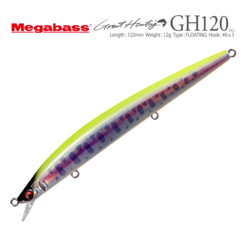 Megabass GH120 является братом-близнецом модели X-120, это такой же ультратонкий продолговатый минноу, который в наших водах с успехом ловит зубастую «травяную» щуку.