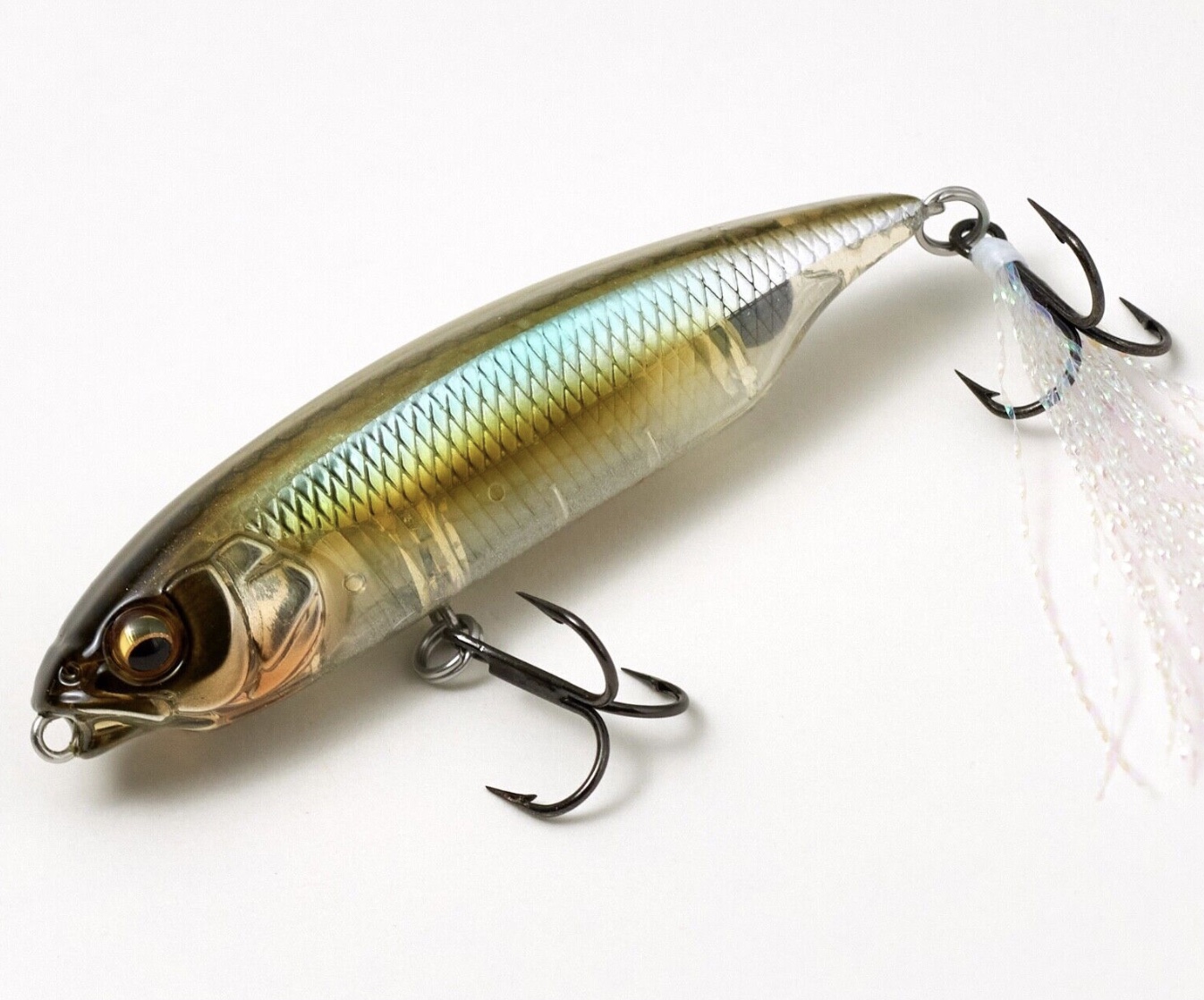 Megabass Karashi - это ультралайтовый воблер, который можно использовать как топвотер и для облавливния более глубоких слоев. Если остановить анимацию, он погружается неспешно ко дну, потому с ним можно облавливать поверхность и более глубокие слои водоема. Геометрия модели близка к волкеру. Однако в головной части внизу есть небольшая выемка, что схожа с попперной. Эта деталь и задает игру приманки. Помогает создавать при резких рывках брызги и пузыри. Хвостовой тройник замаскирован длинной люрексовой мушкой. Для того, чтобы стабилизировать модель, в головной и хвостовой части есть огрузка. Неплотная фиксация элементов обеспечивает дразнящий шумовой эффект.