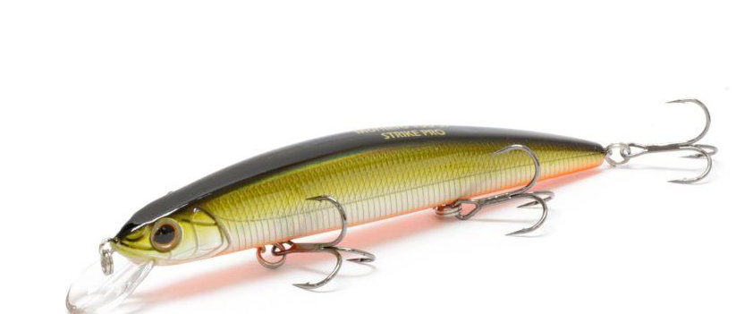 Приманкой высшего класса можно смело назвать воблер типа minnow от компании Strike Pro Montero 130SP. Все в этой приманке на самом высоком уровне: рабочие характеристики, уловистость, покраска, качественные фурнитура и материалы. Воблер будет актуален при облове мелководья и при ловле пассивной хищной рыбы в холодной воде. Внутри приманки расположены три шарика, которые положительно влияют на дальность заброса. На равномерной проводке Montero начинает играть уже на небольших скоростях и обладает отличным роллингом, сверкает оттенками брусковатого тела. При твичинговой проводке приманка очень отзывчивая и позволяет выполнять различные вариации проводок с большим диапазоном отклонений воблера от направления рывка.