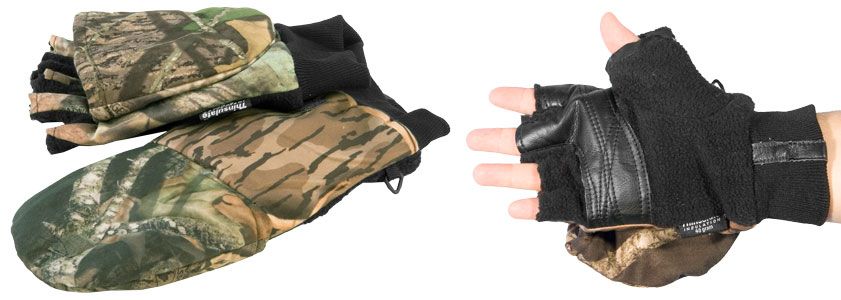 Варежки, перчатки - главной особенностью является совмещение перчаток с укороченными пальцами с полноценной варежкой. Этот тип может использоваться при умеренно холодной погоде. Укороченные пальцы позволяют осуществлять насадку наживки, или смену приманки не снимая перчатку целиком. При необходимости в режиме ожидания, или рыбалки верхние фаланги пальцев закрываются откидывающейся варежкой. В качестве основного материала обычно используется флис, или материал с утеплителем Thinsulate, или Polartec. Этот тип имеет длинные манжеты плотно облегающие кисть руки, что способствует сохранению комфортной температуры внутри перчатки.