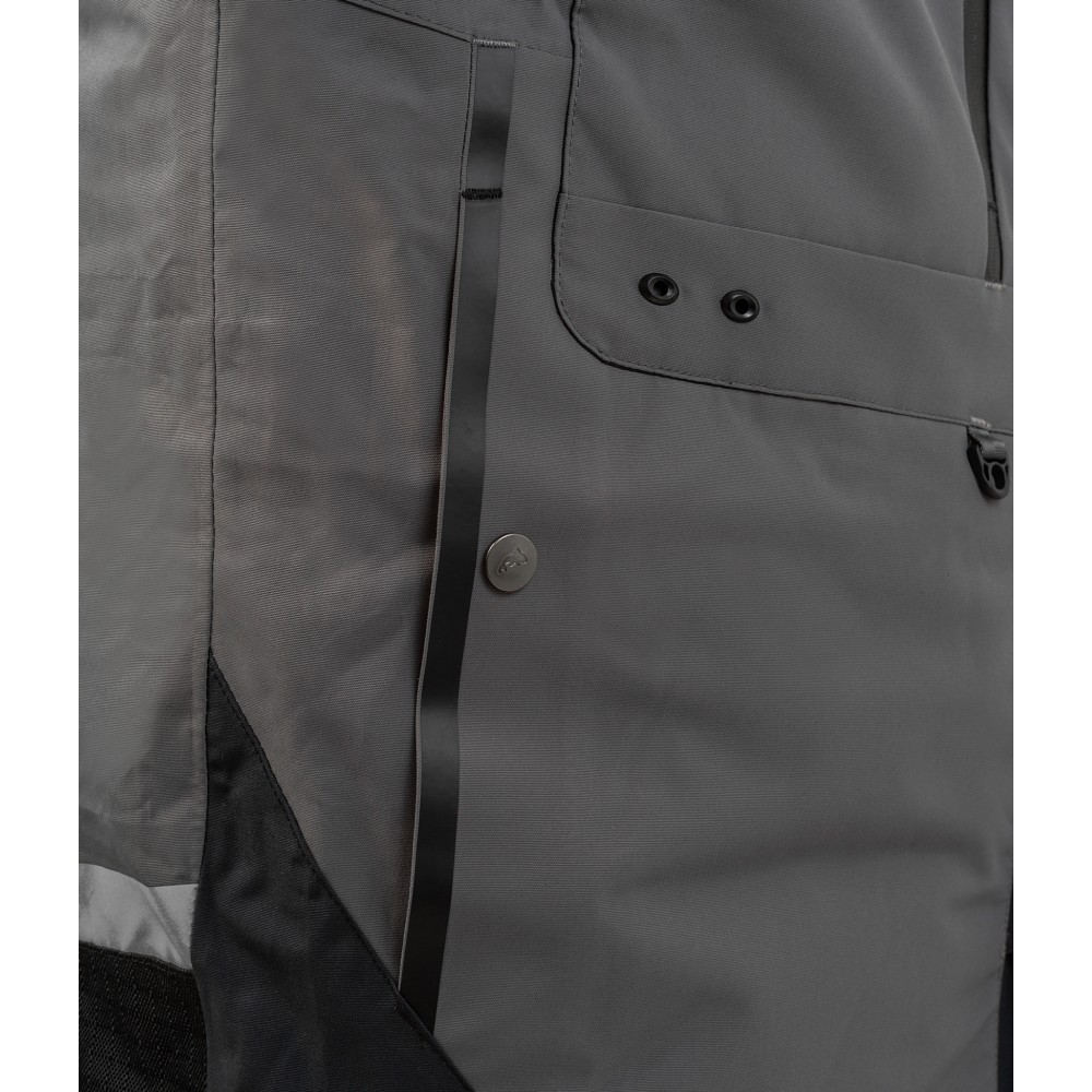Костюм имеет новый стильный дизайн в черно-сером цветовом решении, с ненавящевым добавлением оранжевых фрагментов. Так же на костюме имеется светоотражающие элементы для повышения заметности на рыбалке в целях безопасности.
