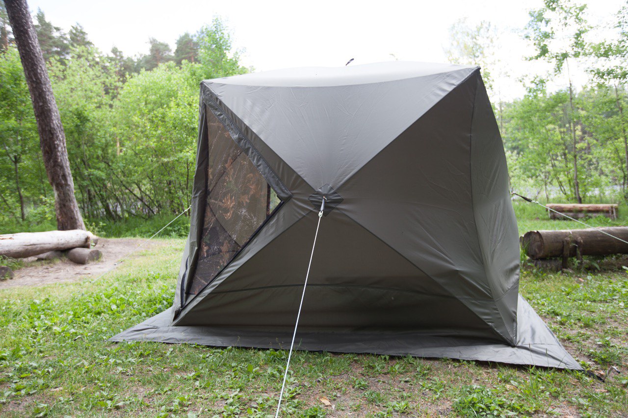 Обратите внимание, что тент не обладает дышащими свойствами. Для циркуляции воздуха внутри палатки рекомендуем использовать форточки и бегунок на входной двери. Также необходимо укрепить палатку растяжками, независимо от наличия ветра.