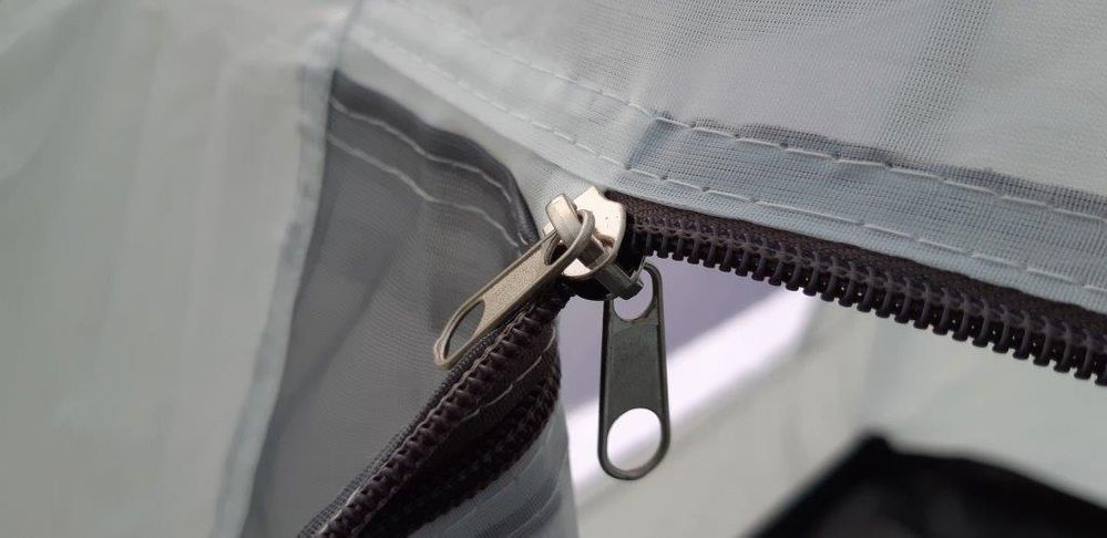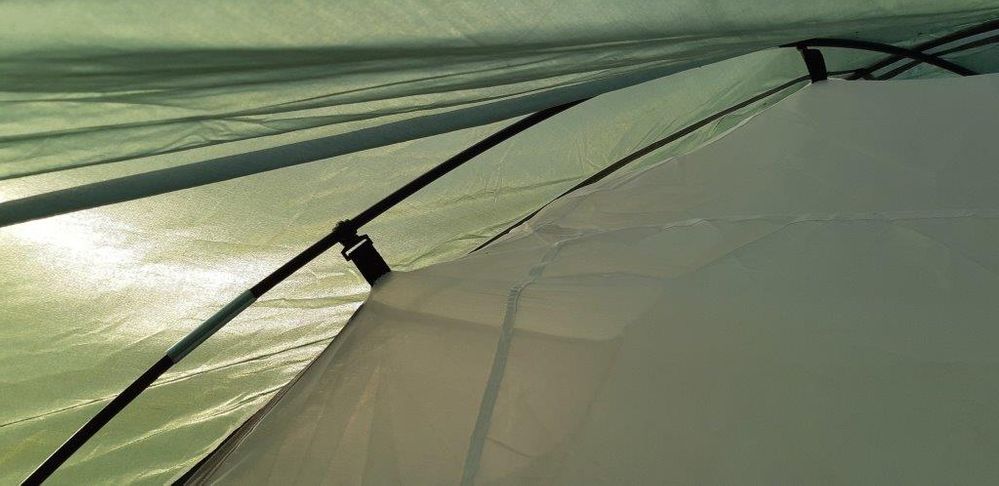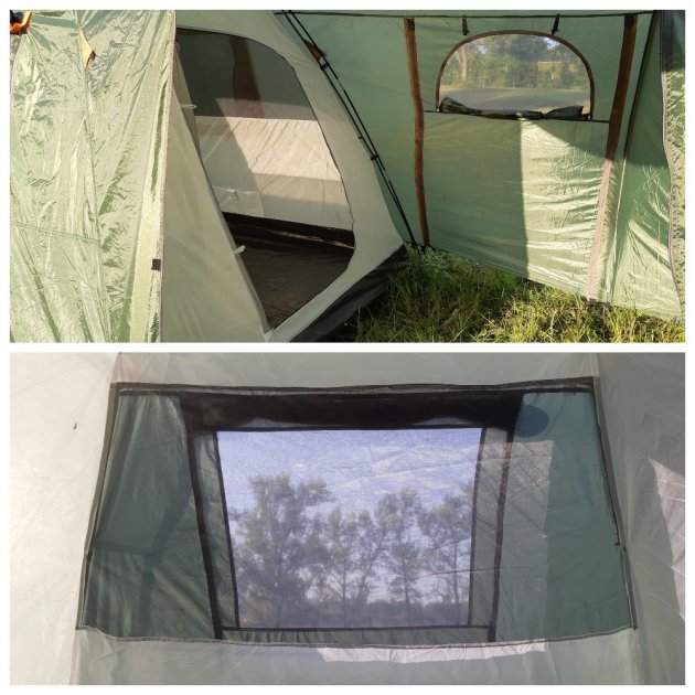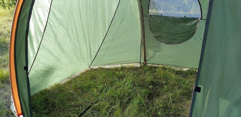 Палатка очень большая и с легкостью вмещает в себя семью из четырех человек. Также она имеет высокие потолки, что не препятствует свободному перемещению. Рекомендую!
