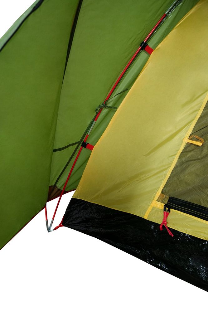 - Входы в палатку оснащены двухзамковыми молниями и удобными фиксаторами для открытых дверей.