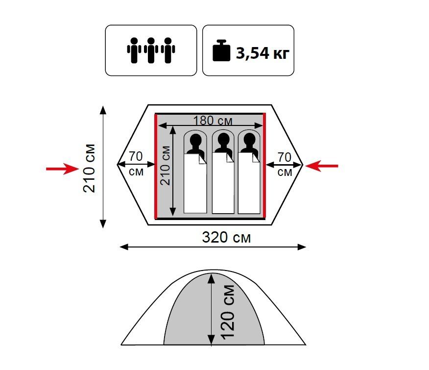Модель отлично вентилируется благодаря 2 симметрично расположенным большим входам палатку и системе вентиляционных окон.
