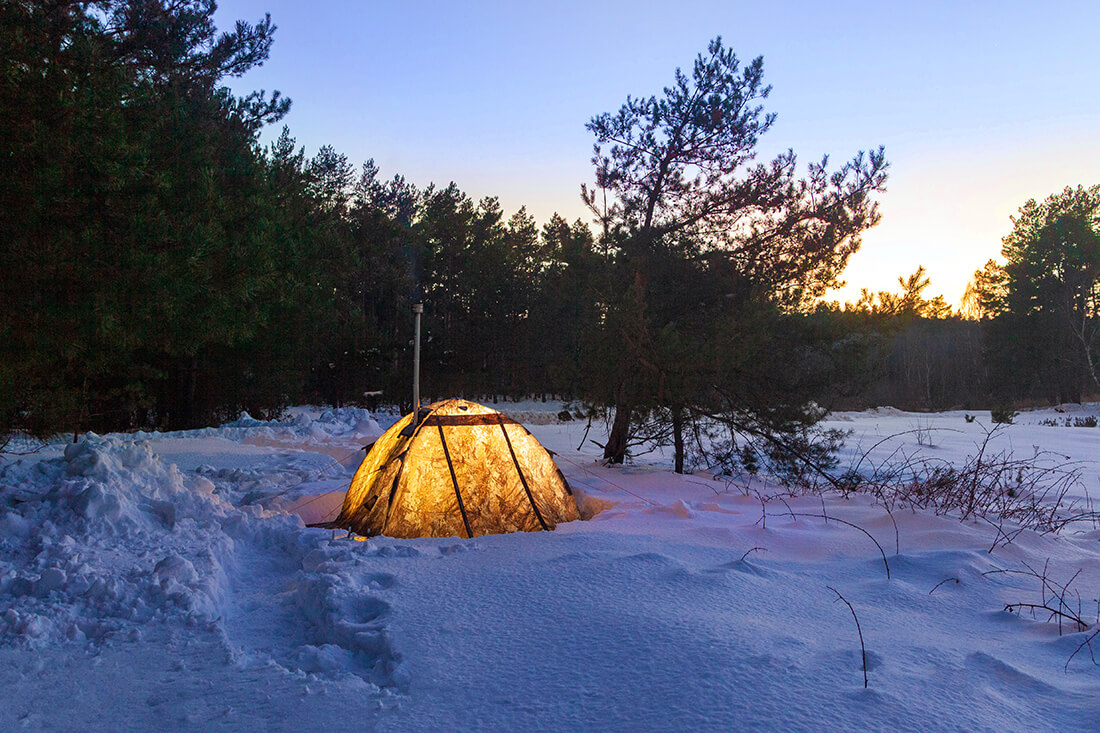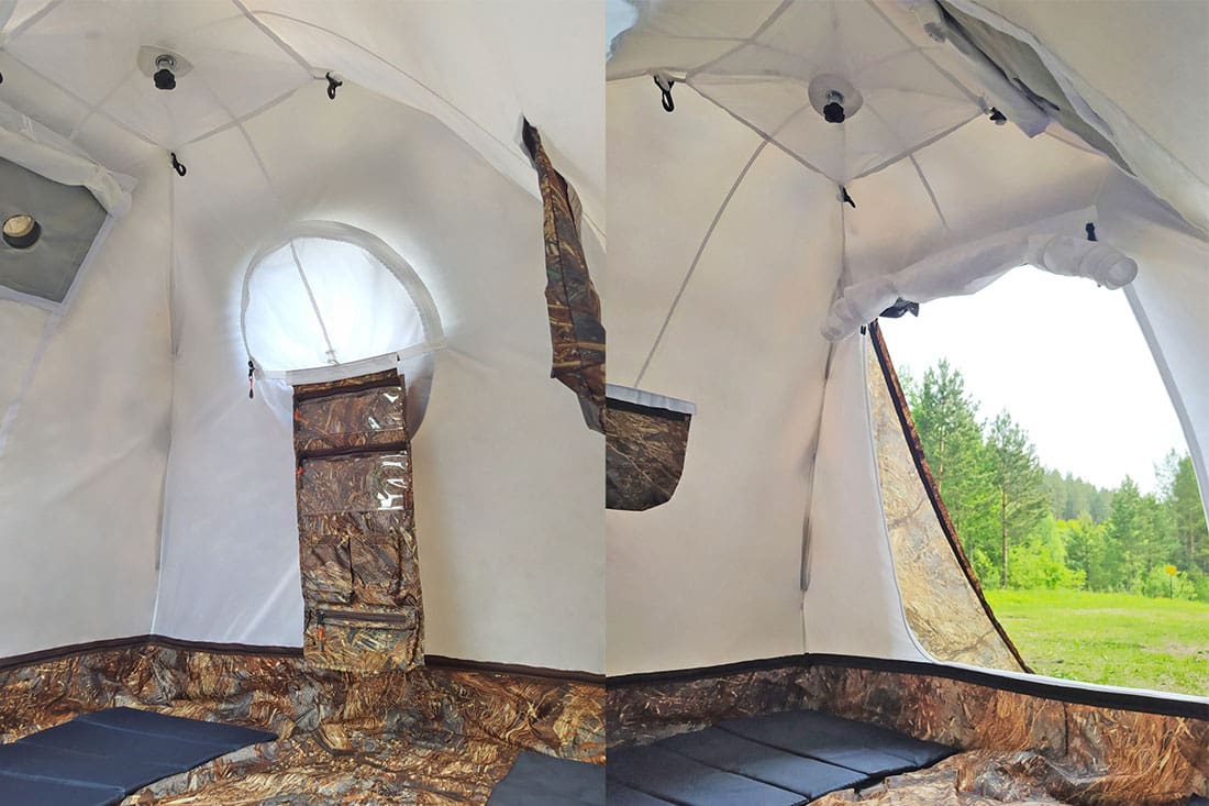 В ее оснащение входит многослойное окно со вставкой из прозрачной морозостойкой силиконовой пленки, разделка дымохода, вход на молнии, москитные сетки на входе и окнах, съемное дно на молнии.