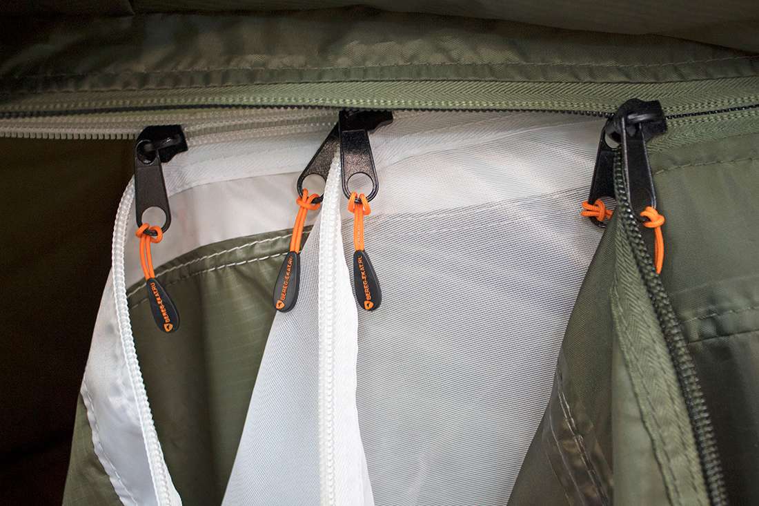 В нижней части палатки расположена защитная юбка с оттяжными петлями для установки кольев или ввертышей.