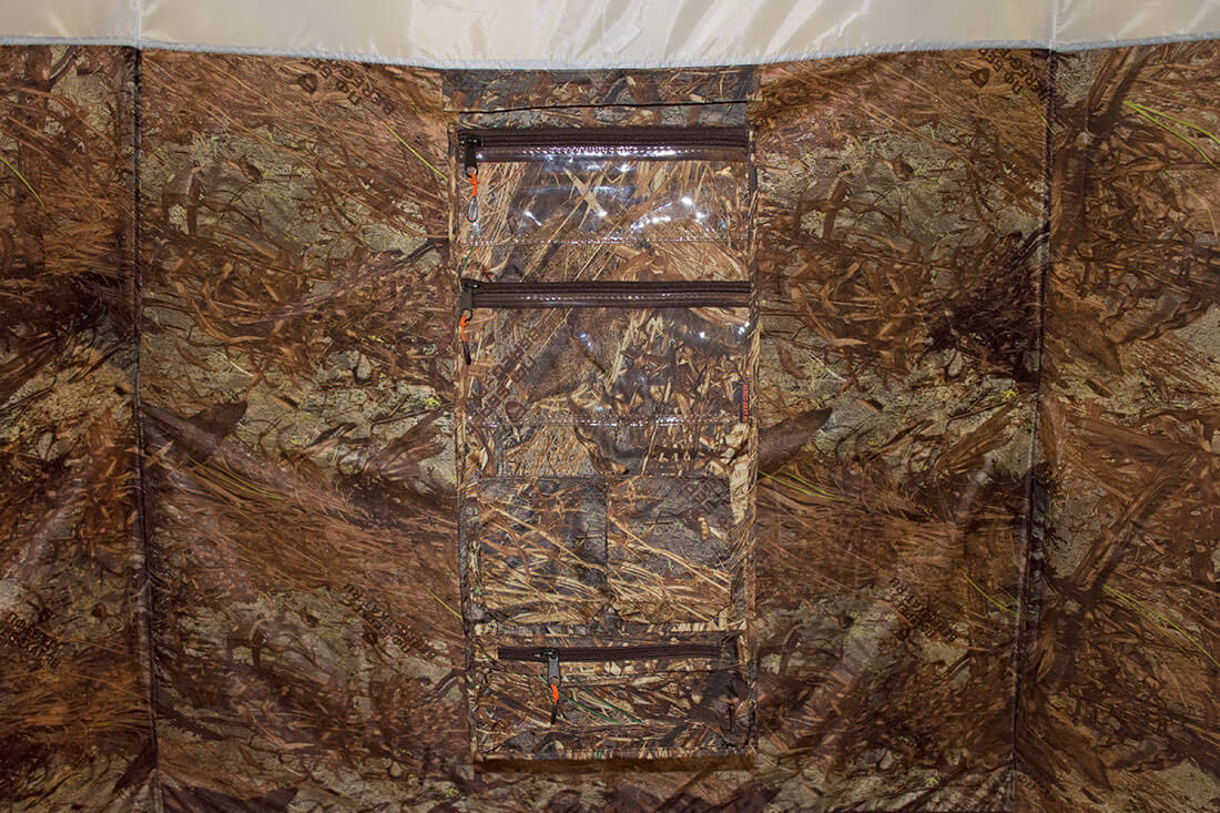 Многофункциональные окна палатки УП-2 состоят из нескольких слоев: защитный клапан с жесткой опорой на липе со стороны внешнего тента, оконное заполнение из прозрачной морозостойкой силиконовой пленки (температура использования до - 50 °C), внешний тент на молнии, антимоскитная сетка на молнии, внутренний тент на молнии.