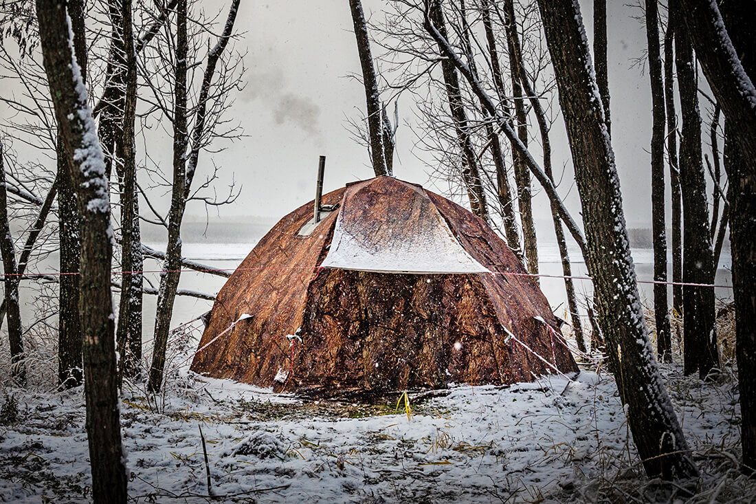В зимней палатке Берег УП-5 рекомендовано применение утепленного дна, арктической накидки (для температур ниже -25 градусов) и походных печей Берег.