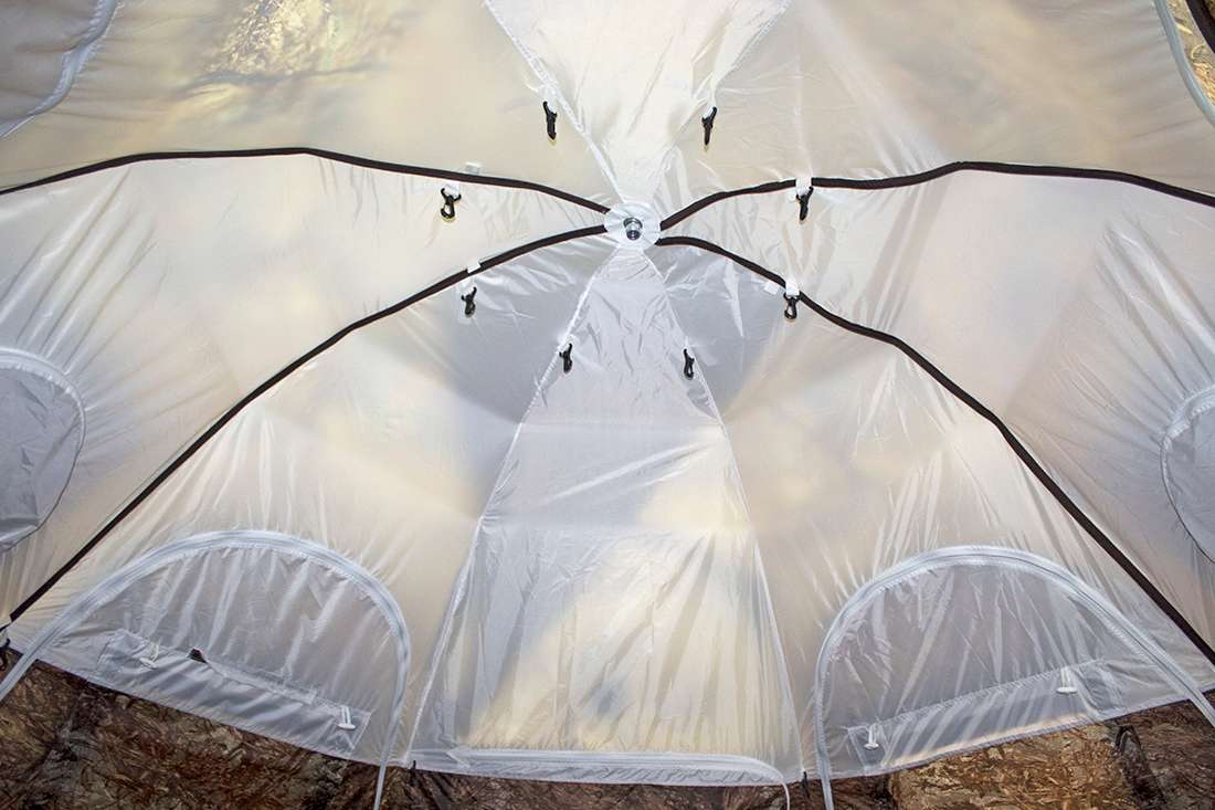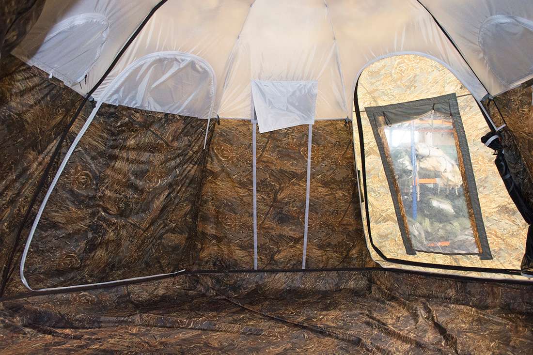 Арочные входы не препятствуют эксплуатации шатра в качестве рыболовной или охотничьей палатки, т.к. на тенте присутствуют смотровые окна и окошко для притока воздуха. При ненадобности он полностью закрываются со стороны внешнего слоя.