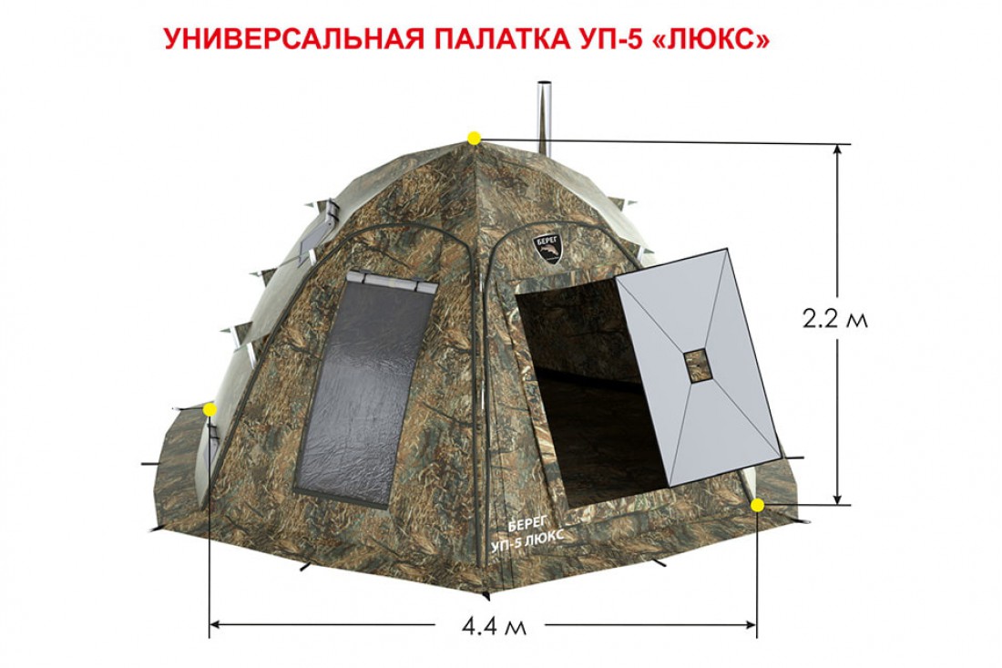 Шатер УП-5 Люкс Берег – универсальная быстросборная палатка-шатер на алюминиевом каркасе, предназначенная для размещения восьми человек в спальных мешках (максимальная вместимость без печи).