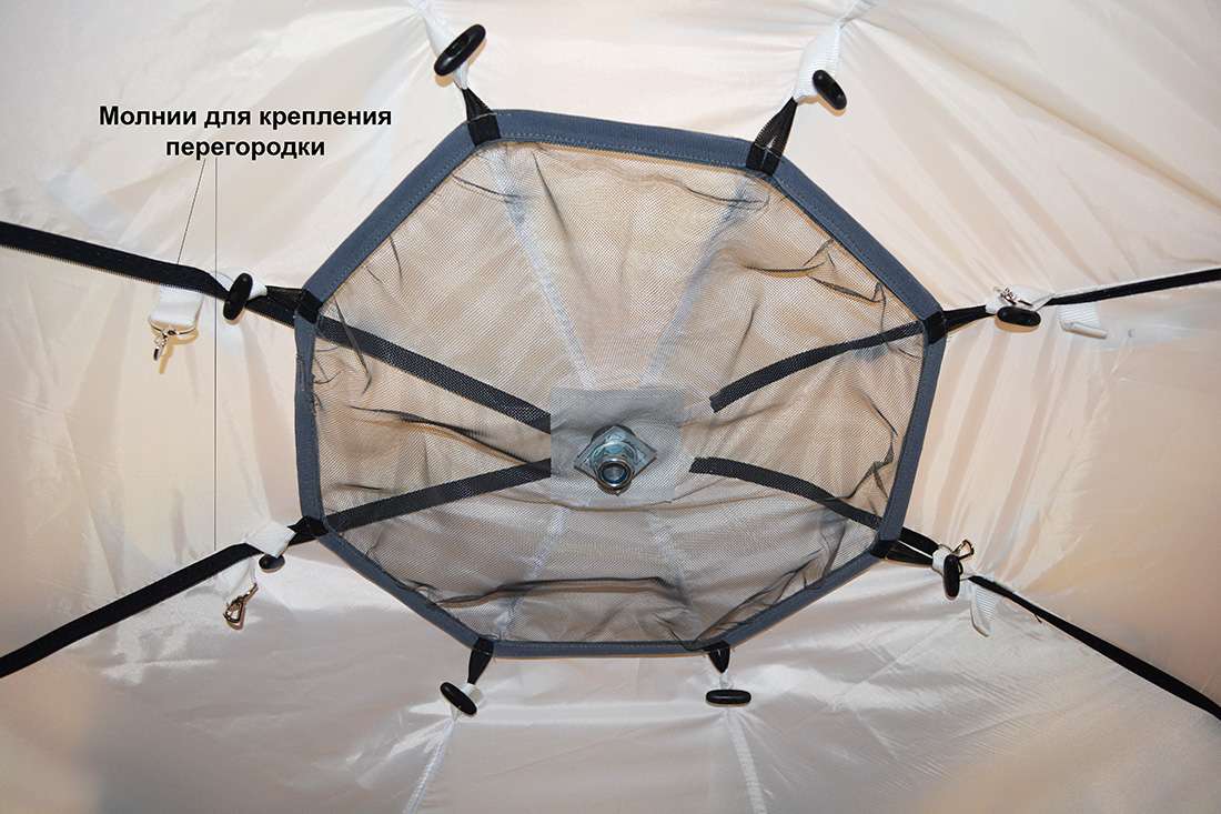 Отличительная особенность УП-5 Люкс в наличии двух молний для крепления перегородки. Перегородка поставляется в базовом комплекте. Оборудована входом, может устанавливаться в четыре различных положения, разделяя палатку на 2 отдельные комнаты.