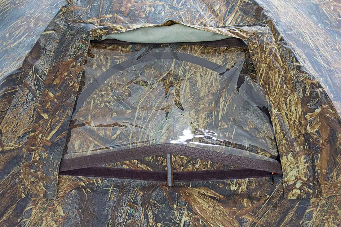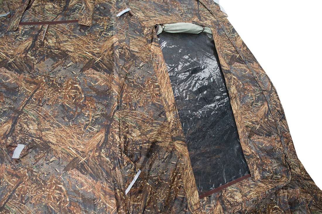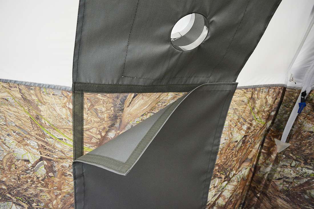 Смотровые окна состоят из: защитный клапан на липе, внешний тент, прозрачное оконное заполнение из морозостойкой силиконовой пленки на липе, москитная сетка, внутренний тент. Со стороны наружного тента можно установить специальную подпорку - так будет происходить вентилирование помещения без попадания внутрь палатки осадков.