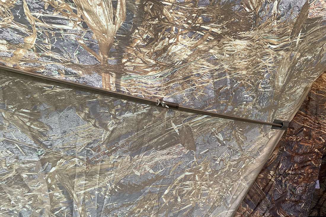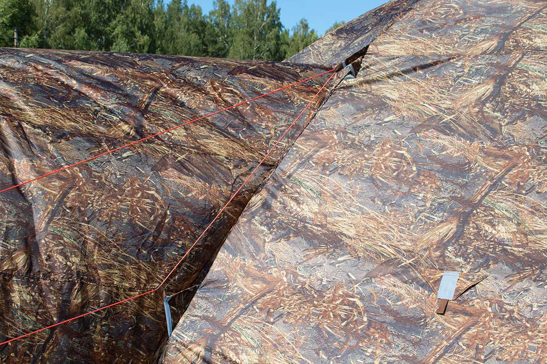 Внешний тент изготавливается из влагостойкой морозостойкой ткани Оксфорд 300 PU 4000. Соединяется с каркасом липами из морозостойкого ПВХ, размещенными в местах сгибов и предотвращающими складывание дуг и повреждение палатки.
