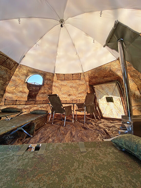 - универсальность (в комплектацию входит разделка дымохода, позволяющая использовать палатку как жилой модуль, баню и т. д.);