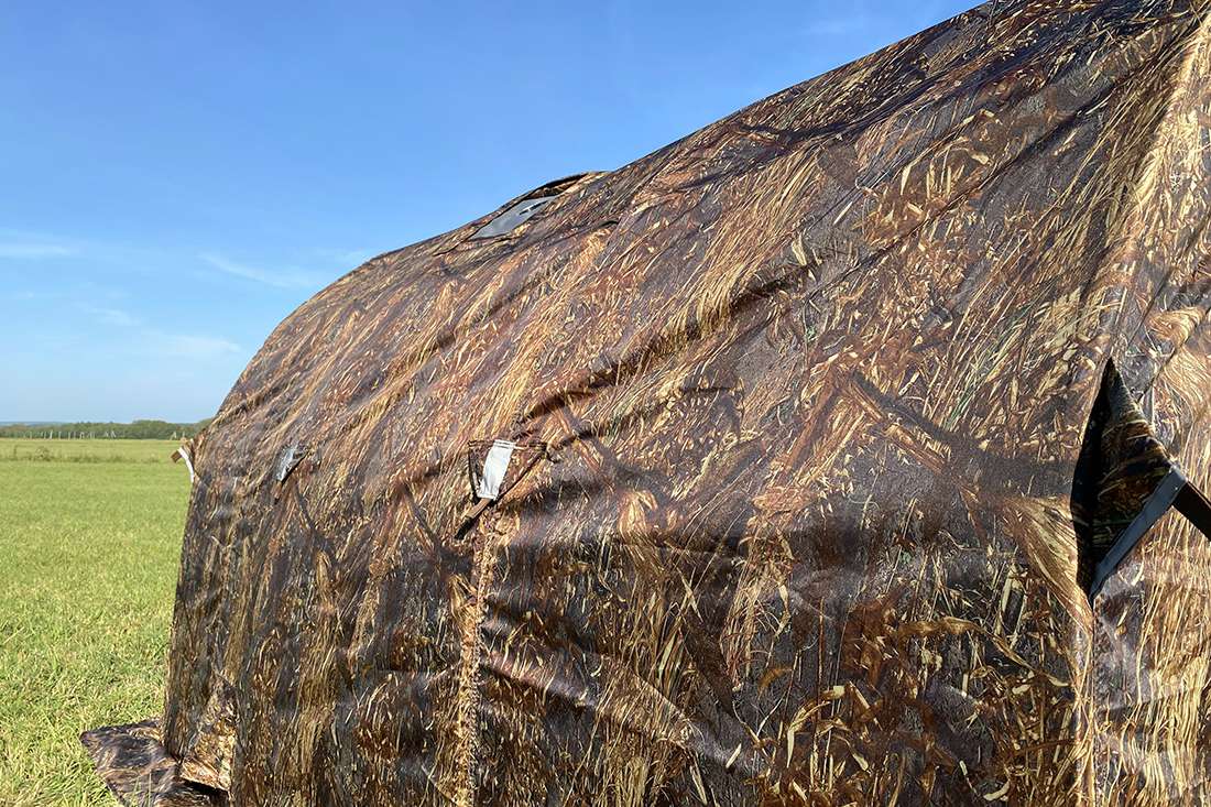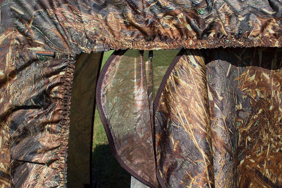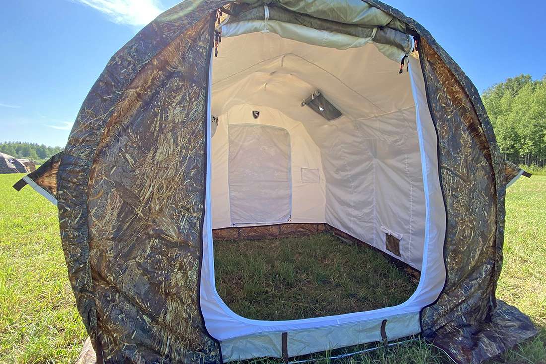 Тамбур-баня оборудован алюминиевым каркасом, перегородкой на молнии, разделкой дымохода, двумя входами на молнии, распашной дверью, окнами с москитными сетками и липами для крепления палаткам УП